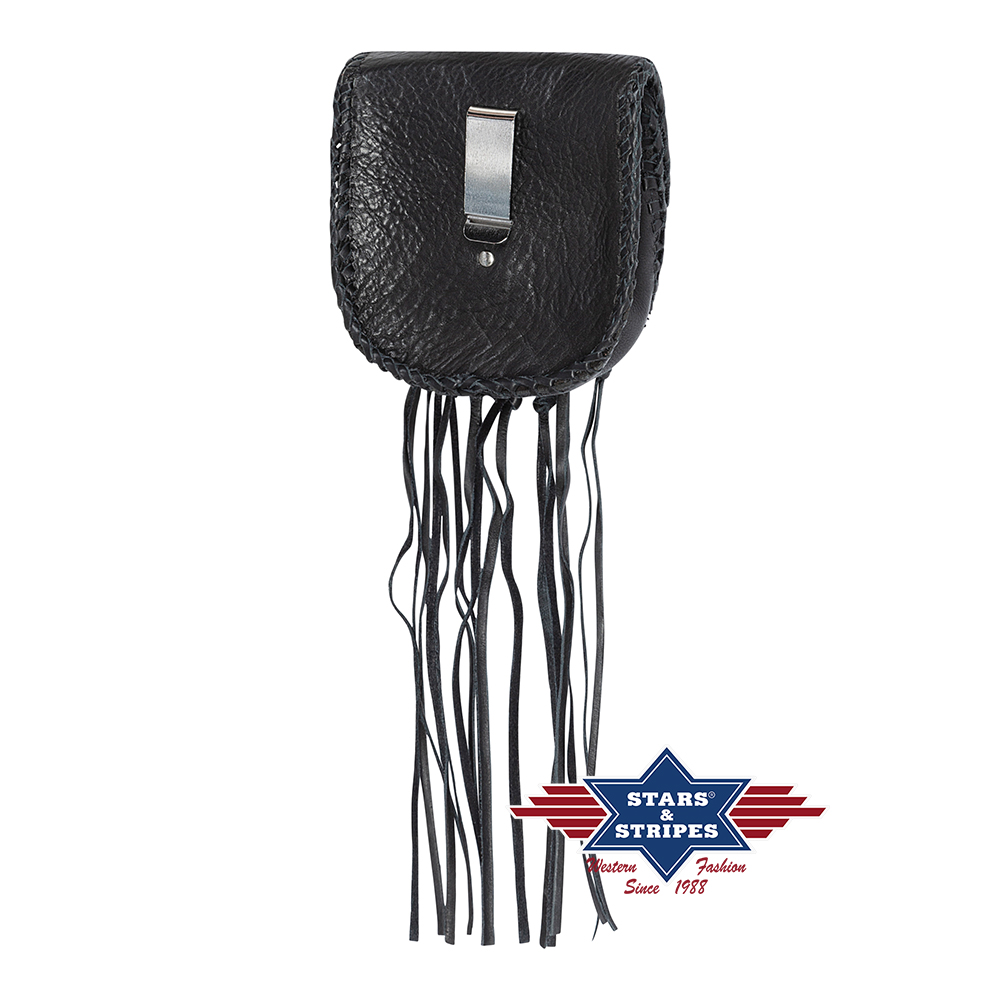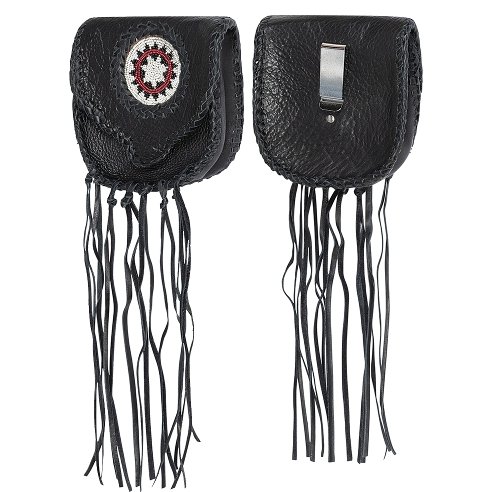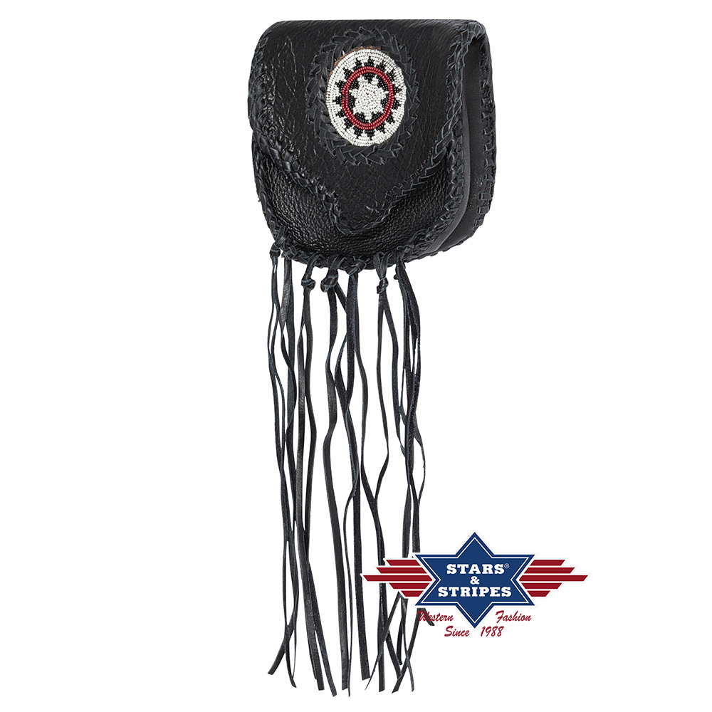Charmant klein leren tasje. Het is bedoeld om aan de riem te bevestigen en heeft effectieve kleuraccenten en franjes. Met de Indiase motieven en de stijlvolle vetersluiting een echte blikvanger. Ook verkrijgbaar in bruin en beige.