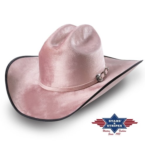 Rozekleurige westernhoed van polyester. De hoedband met exclusieve gesp is subtiel versierd met kleine strass-steentjes. De hoed is duurzaam, vormvast, waterafstotend en heeft een verstelbare binnenband.