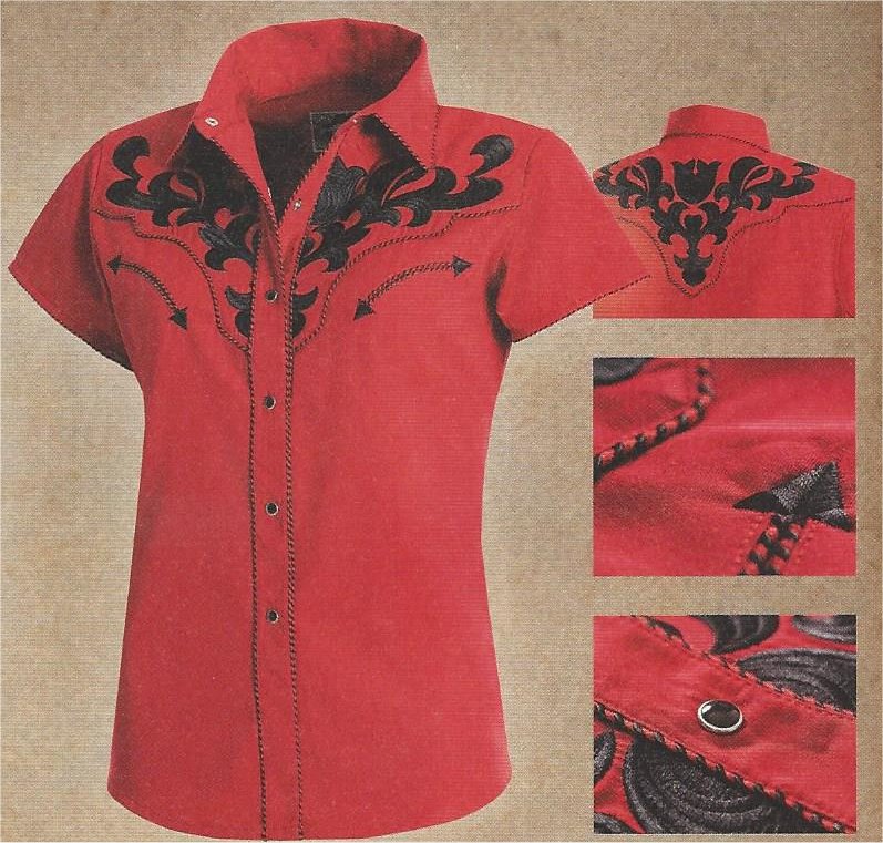 Stoere dames westernshirt met korte mouw. Geborduurd aan de voor- en achterkant, met drukknopen en twee nepzakken aan de voorkant.