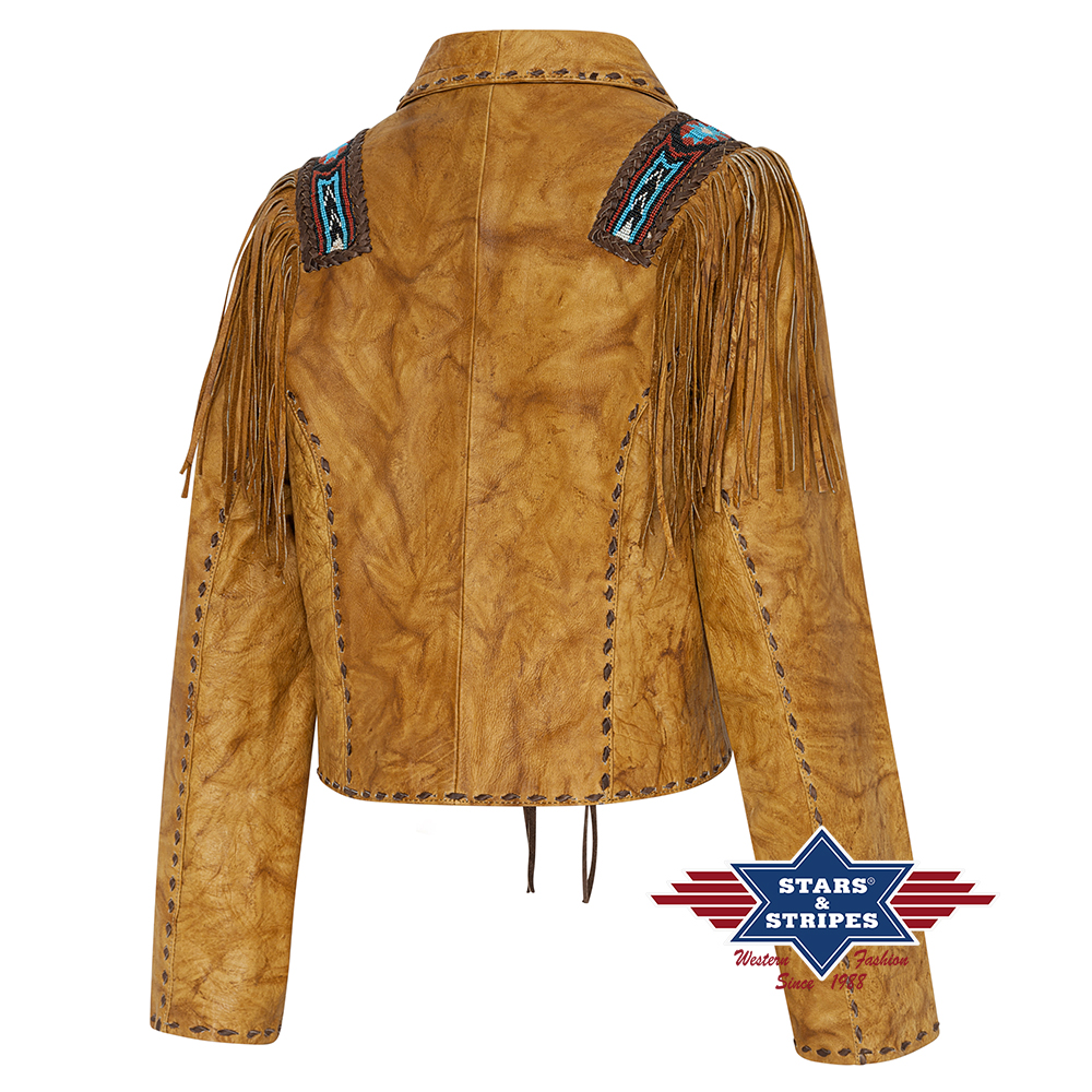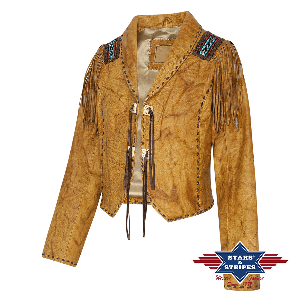 Hoogwaardig western leren jack, zeer comfortabel om te dragen, gemaakt van hoogwaardig rundleer, ongelooflijk zacht en ademend. Effectief verwerkt met franjes, kleuraccenten, een Indiaas kralenpatroon en stijlvolle vetersluiting.