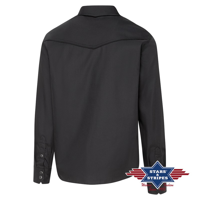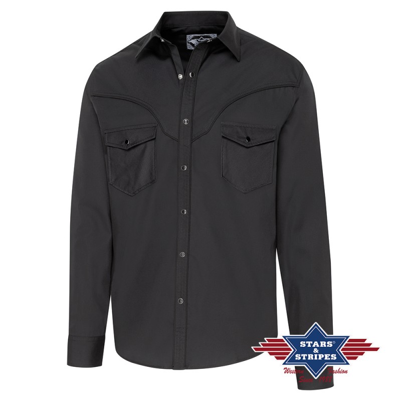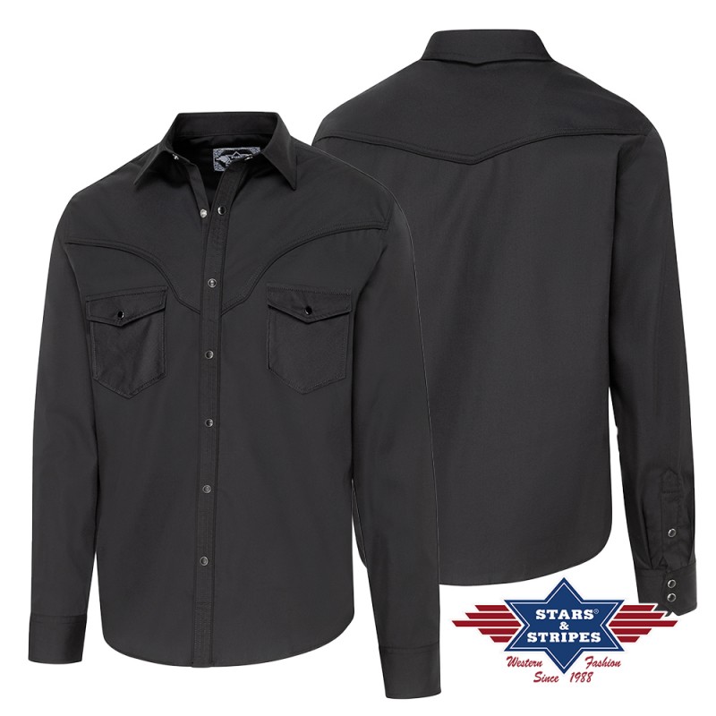 Klassiek western shirt in zwarte stof met drukknoopsluiting, lange mouwen, paspel zakken aan de voorkant en belijning bij pas en sluiting.